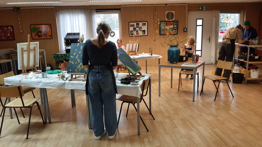 10.03. Kartondruck; 17.03. Gestalten mit Ton; 24.03. Malen auf Leinwand; 07.04. in der Keramikwerkstatt
