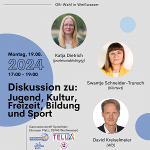 Am Montag, den 19. August 2024, lädt der Jugendring Oberlausitz e.V. gemeinsam mit seinen Mitgliedsvereinen Station Weißwasser e.V., Mobile Jugendarbeit und Soziokultur e.V. sowie dem Schlupfwinkel – Generationstreff SpinnNetz zu einer Diskussionsveranstaltung anlässlich der bevorstehenden Oberbürgermeisterwahl in Weißwasser ein. Die Veranstaltung findet von 17:00 bis 19:00 Uhr in den Räumen des Generationstreff SpinnNetz (Sorauer Platz 1, 02943 Weißwasser) statt.