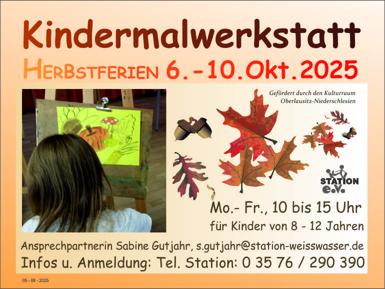 In der ersten Woche der Herbstferien – vom 06. bis 10.Oktober 2025 – treffen wir uns wieder zum gemeinsamen Malen, Zeichnen und Gestalten! Von Montag bis Freitag verwandeln wir die Station von 10 bis 15 Uhr in unsere Kunstwerkstatt. Wir stellen Staffeleien auf und bringen Herbstfarben auf`s Papier. Am letzten Tag endet die bunte Woche mit einer kleinen Ausstellung.