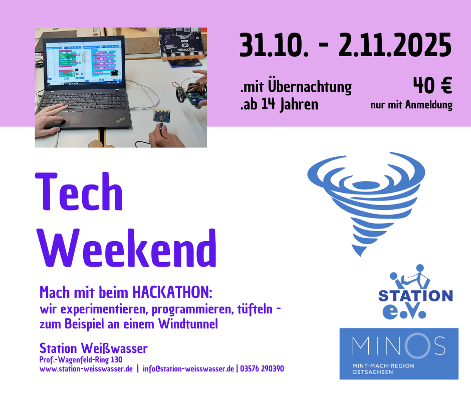wir tüfteln, programmieren und experimentieren – zum Beispiel an einem Windtunnel / für Teilnehmende von 14-20 Jahren / Teilnahmebeitrag 40 € (inkl. Verpflegung und Übernachtung) / nur mir Anmeldung unter c.mueller@station-weisswasser.de oder 03576 290 390